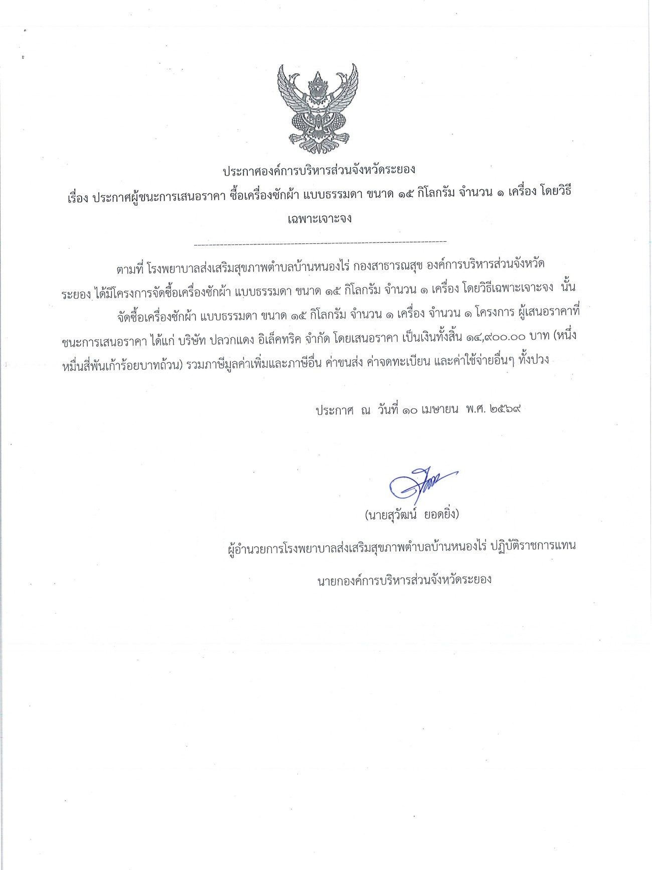 ประกาศผู้ชนะการเสนอราคา จัดซื้อเครื่องซักผ้า แบบธรรมดา ขนาด 15 กก. จำนวน 1 เครื่อง โดยวิธีเฉพาะเจาะจง