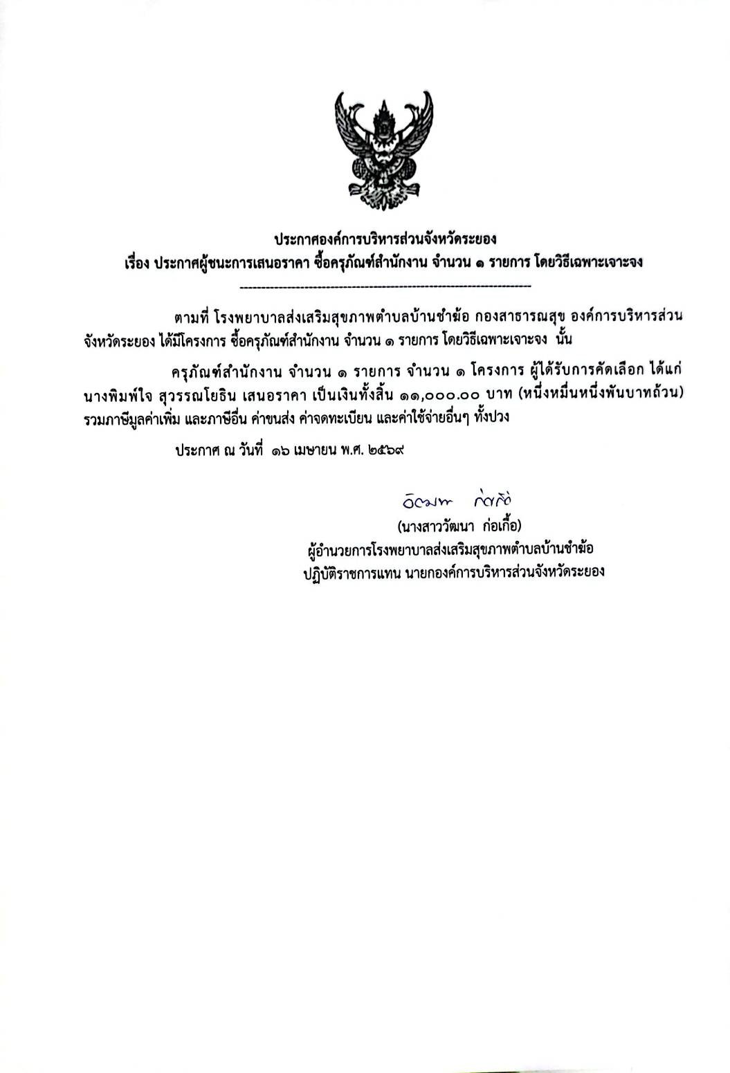ประกาศผู้ชนะการเสนอราคา ซื้อครุภัณฑ์สำนักงาน จำนวน 1 รายการ โดยวิธีเฉพาะเจาะจง