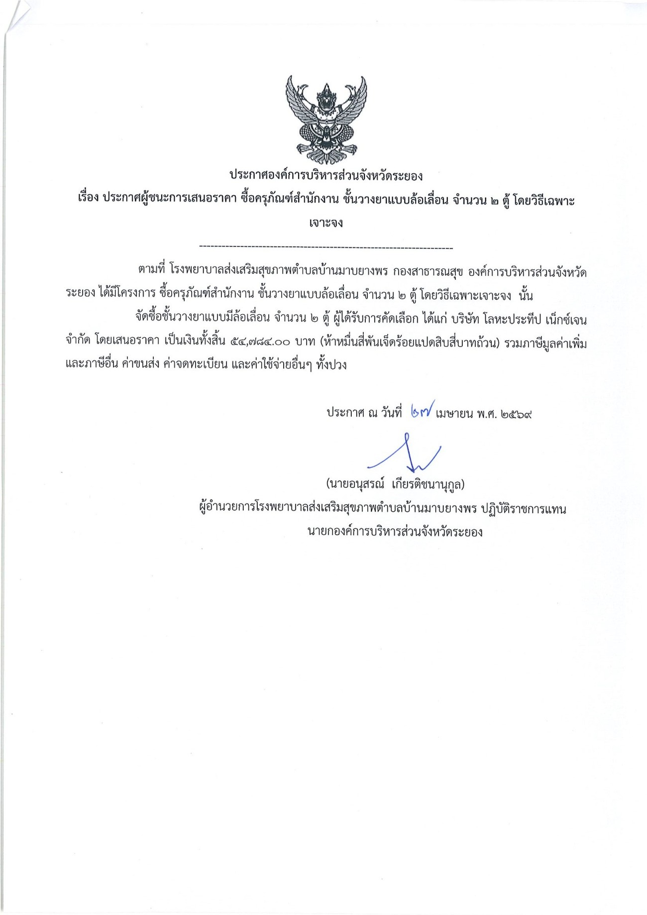 ประกาศผู้ชนะการเสนอราคา ซื้อครุภัณฑ์สำนักงาน ชั้นวางยาแบบล้อเลื่อน จำนวน 2 ตู้ โดยวิธีเฉพาะเจาะจง