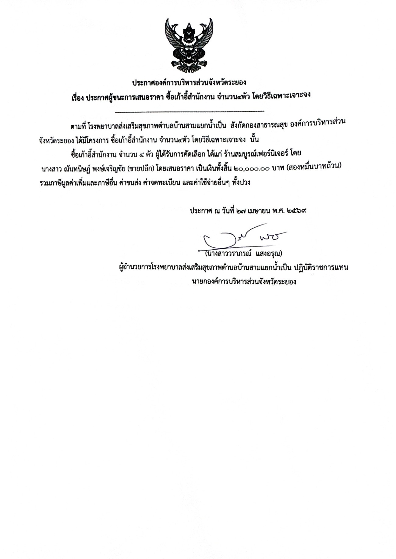 ประกาศผู้ชนะการเสนอราคา ซื้อเก้าอี้สำนักงาน จำนวน 4 ตัว โดยวิธีเฉพาะเจาะจง