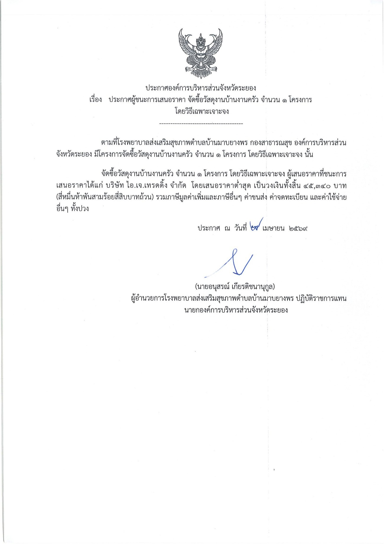 ประกาศผู้ชนะการเสนอราคาโครงการก่อสร้างถนนสายขวากลิง - ยายดา ๒ ศาลาแม่เนื่อง - เขาพระบาท
