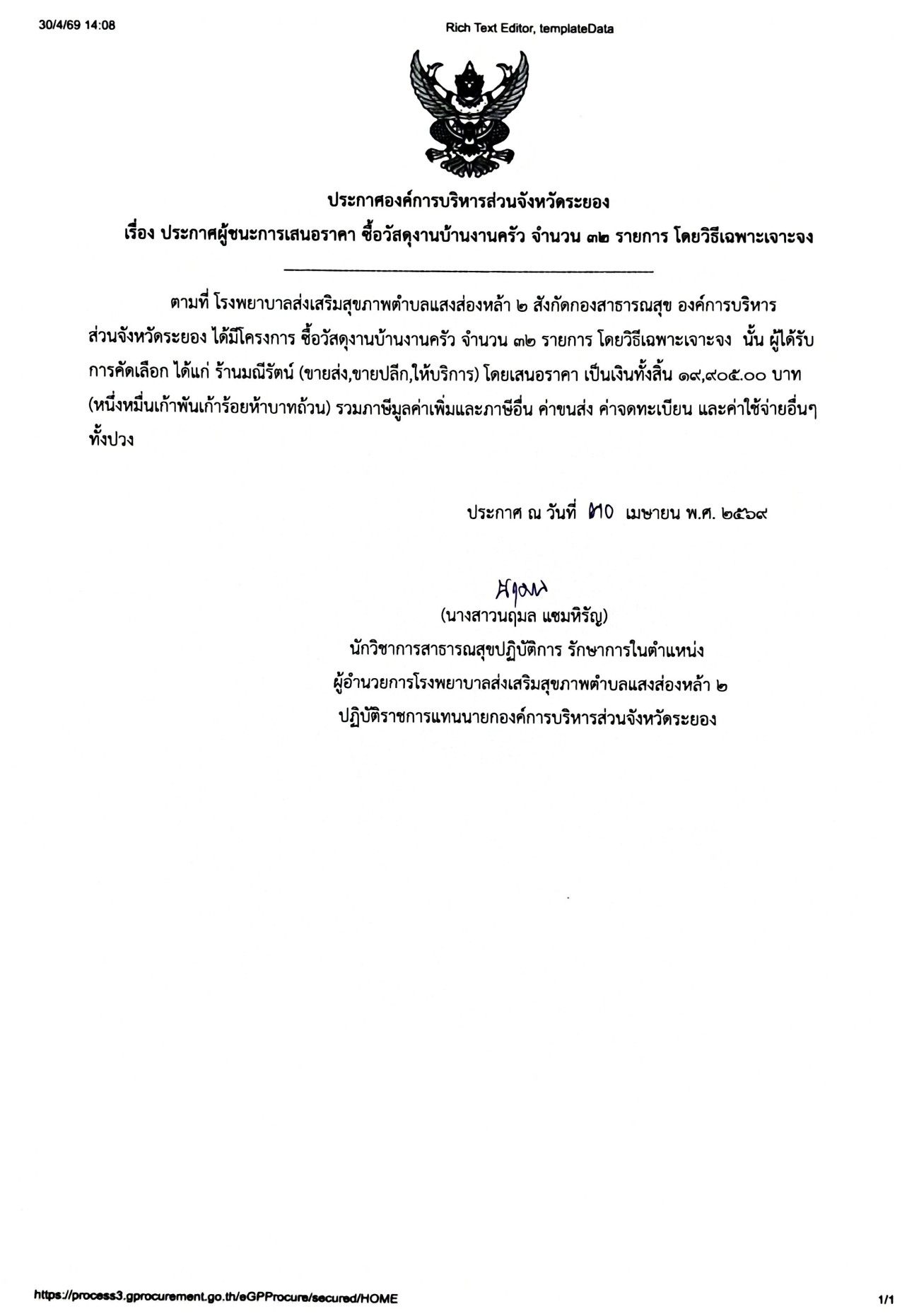 ประกาศผู้ชนะการเสนอราคา ซื้อวัสดุงานบ้านงานครัว จำนวน 32 รายการ โดยวิธีเฉพาะเจาะจง