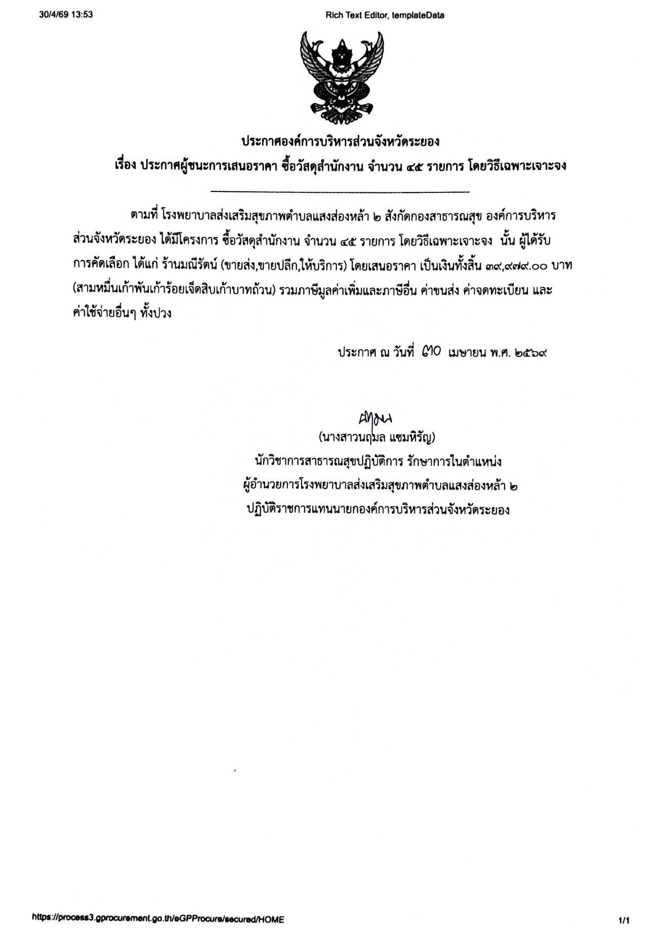 ประกาศผู้ชนะการเสนอราคา ซื้อวัสดุสำนักงาน จำนวน 45 รายการ โดยวิธีเฉพาะเจาะจง
