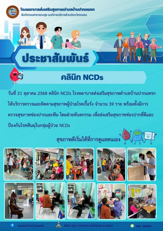 วันที่ 21 ตุลาคม 2568 คลินิก NCDs รพ.สต.บ้านปากแพรก ให้บริการตรวจและติดตามสุขภาพผู้ป่วยโรคเรื้อรัง จำนวน 39 ราย 22 ตุลาคม 2568 113