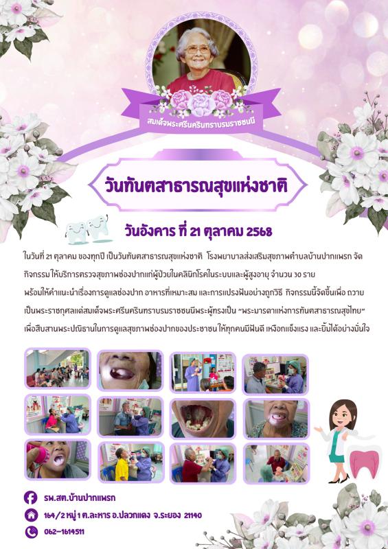 วันที่ 21 ตุลาคม 2568 "วันทันตสาธารณสุขแห่งชาติ" รพ.สต.บ้านปากแพรก จัดกิจกรรมให้บริการตรวจสุขภาพช่องปากแก่ผู้ป่วย จำนวน 30 ราย 22 ตุลาคม 2568 102