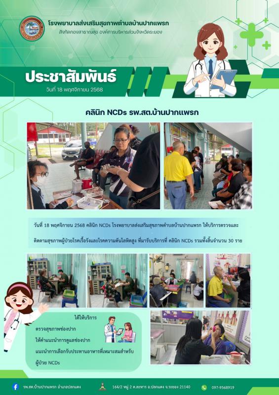 วันที่ 18 พฤศจิกายน 2568 คลินิก NCDs รพ.สต.บ้านปากแพรก ให้บริการตรวจและติดตามสุขภาพผู้ป่วยโรคเรื้อรังและความดันโลหิตสูง และตรวจสุขภาพช่องปากพร้อมให้คคำแนะนำในการดูแลสุขภาพช่องปาก จำนวน 30 ราย 19 พฤศจิกายน 2568 117