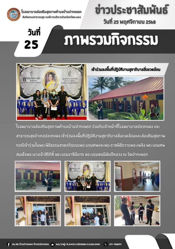 วันที่ 25 พฤศจิกายน 2568 รพ.สต.บ้านปากแพรก ร่วมกับ จนท.รพ.ปลวกแดง และ สสอ.ปลวกแดง เข้าร่วมลงพื้นที่ปฏิบัติงานสุขาภิบาลสิ่งแวดล้อมและส่งเสริมสุขภาพ ณ วัดปากแพรก 27 พฤศจิกายน 2568 63