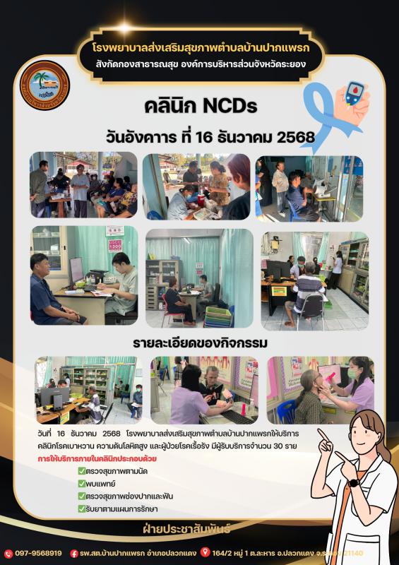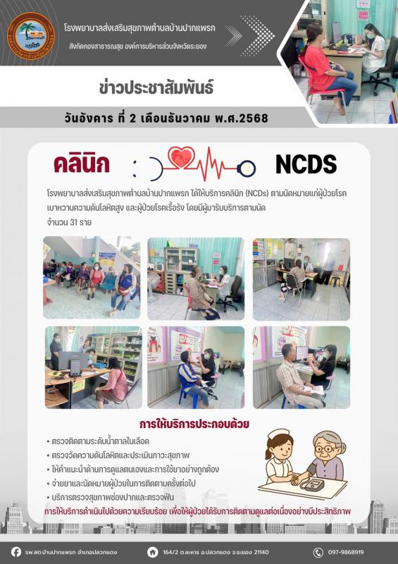 วันที่ 16 ธันวาคม 2568 รพ.สต.บ้านปากแพรก ให้บริการคลินิกโรคเบาหวาน ความดันโลหิตสูง และโรคเรื้อรัง จำนวน 30 ราย 17 ธันวาคม 2568 10