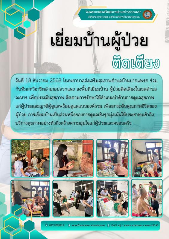 วันที่ 18 ธันวาคม 2568 รพ.สต.บ้านปากแพรก ร่วมกับทีมสหวิชาชีพอำเภอปลวกแดง ลงพื้นที่เยี่ยมบ้าน ผู้ป่วยติดเตียงในเขตตำบลละหาร เพื่อประเมินสุขภาพ ติดตามการรักษาและให้คำแนะนำด้านสุขภาพ 19 ธันวาคม 2568 4