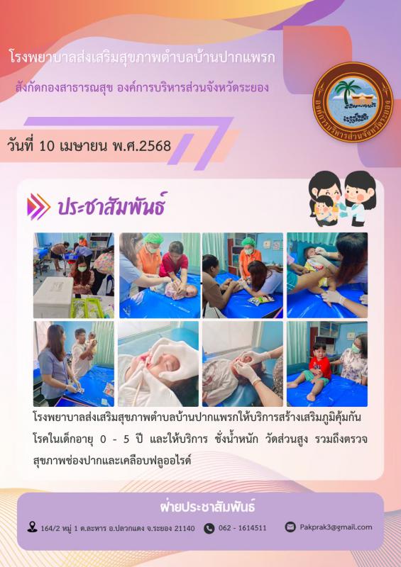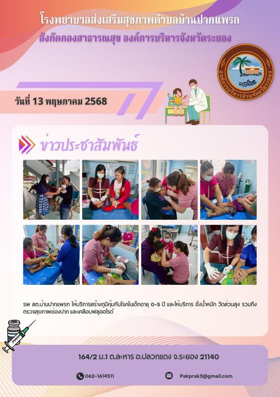 วันที่ 13 พฤษภาคม 2568 รพ.สต.บ้านปากแพรก ให้บริการสร้างเสริมภูมิคุ้มกันโรคในเด็กอายุ 0-5 ปี และให้บริการชั่งน้ำหนัก วัดส่วนสูง รวมถึงตรวจสุขภาพช่องปากและเคลือบฟลูออไรด์ 14 พฤษภาคม 2568 292