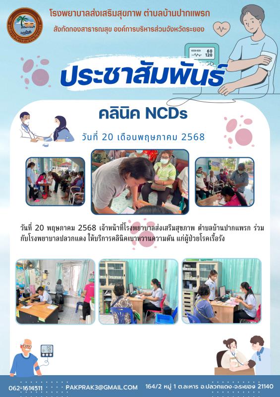 วันที่ 20 พฤษภาคม 2568 เจ้าหน้าที่ รพ.สต.บ้านปากแพรก ร่วมกับ รพ.ปลวกแดง ให้บริการคลินิกเบาหวาน / ความดัน แก่ผู้ป่วยโรคเรื้อรัง 21 พฤษภาคม 2568 320