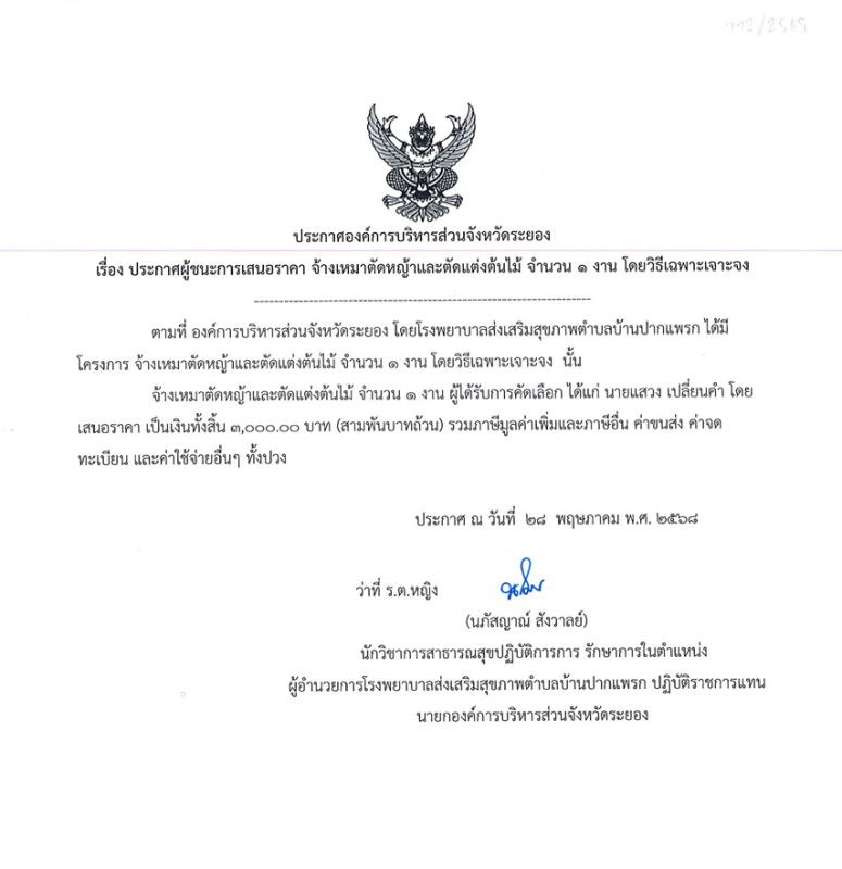 ประกาศผู้ชนะการเสนอราคา จ้างเหมาตัดญ้าและตัดแต่งต้นไม้ จำนวน 1 งาน โดยวิธีเฉพาะเจาะจง 28 พฤษภาคม 2568 414