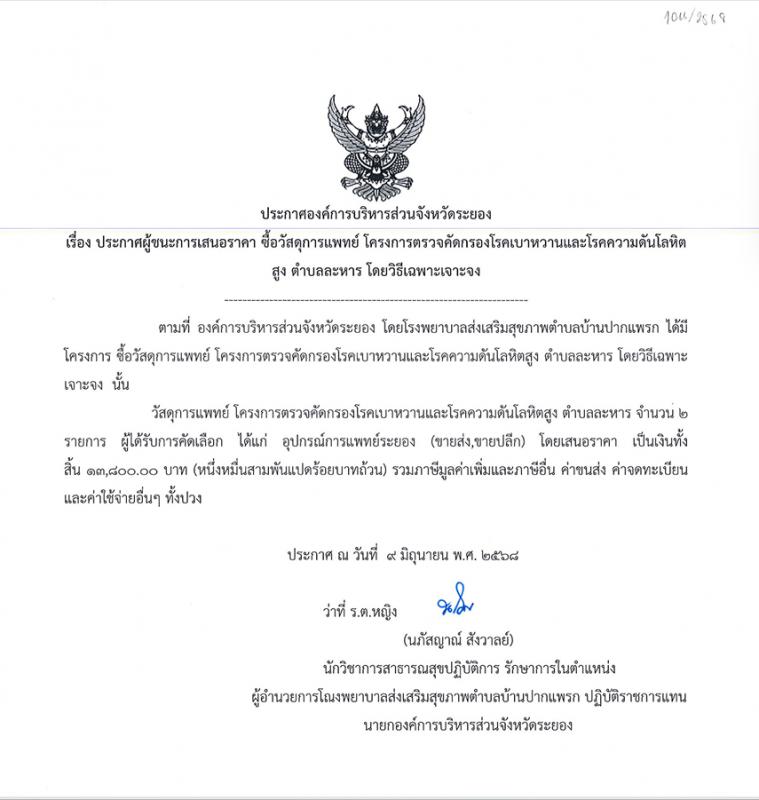 ประกาศผู้ชนะการเสนอราคา ซื้อวัสดุทางการแพทย์ โครงการตรวจคัดกรองเบาหวานและความดันโลหิตสูง ตำบลละหาร โดยวิธีเฉพาะเจาะจง 9 มิถุนายน 2568 354