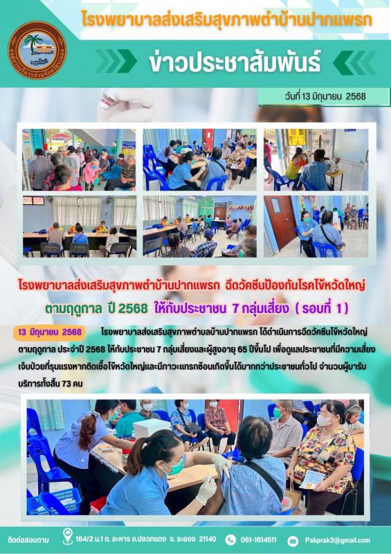 วันที่ 13 มิถุนายน 2568 รพ.สต.บ้านปากแพรก ฉีดวัคซีนป้องกันโรคไข้หวัดใหญ่ตามฤดูกาล ปี 2568 ให้กับประชาชน 7 กลุ่มเสี่ยง (รอบที่ 1) 13 มิถุนายน 2568 358