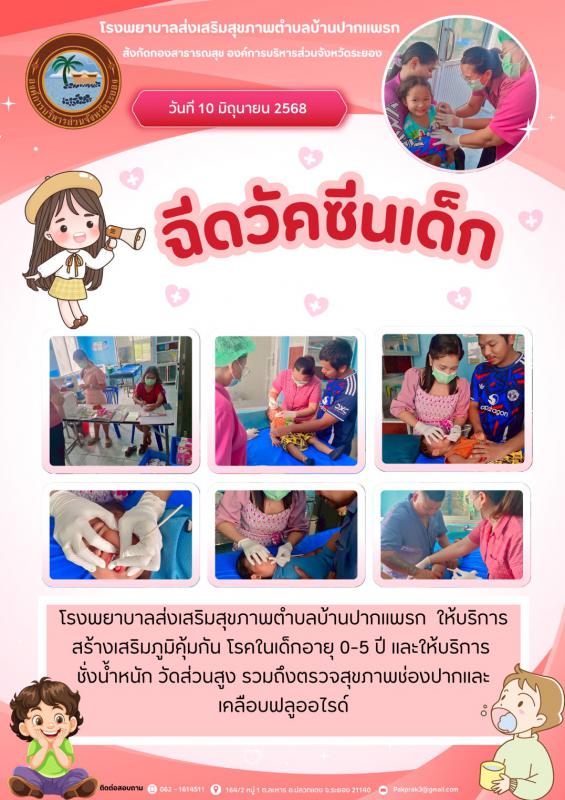 วันที่ 10 มิถุนายน 2568 รพ.สต.บ้านปากแพรก ให้บริการสร้างเสริมภูมิคุ้มกันโรคในเด็กอายุ 0-5 ปี และให้บริการชั่งน้ำหนัก วัดส่วนสูง รวมถึงตรวจสุขภาพช่องปากและเคลือบฟลูออไรด์ 11 มิถุนายน 2568 245