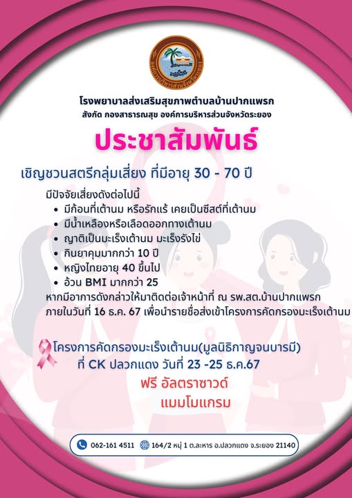 เชิญชวนตรีกลุ่มเสี่ยงที่มีอายุ 30-70 ปี คัดกรองมะเร็งเต้านม