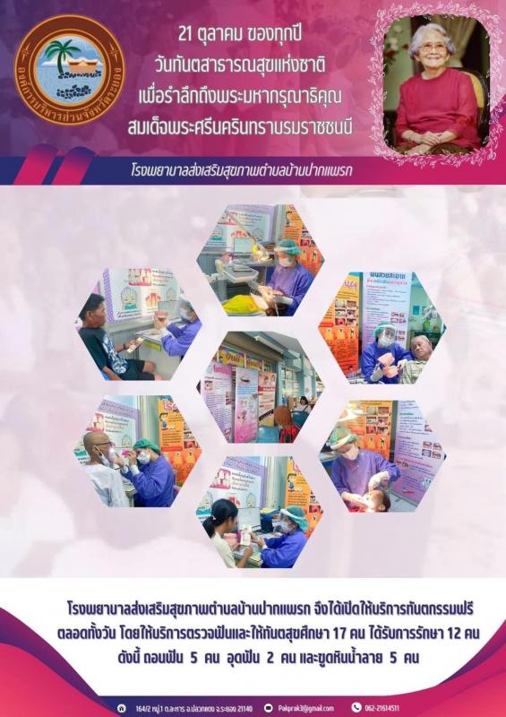 วันที่ 21 ตุลาคม ของทุกปี วันทันตสาธารณสุขแห่งชาติเพื่อรำลึกถึงพระมหากรุณาธิคุณ สมเด็จพระศรีนครินทราบรมหาราชชนนี รพ.สต.บ้านปากแพรกจึงได้เปิดให้บริการทันตกรรมฟรีตลอดทั้งวัน 8 พฤศจิกายน 2567 581
