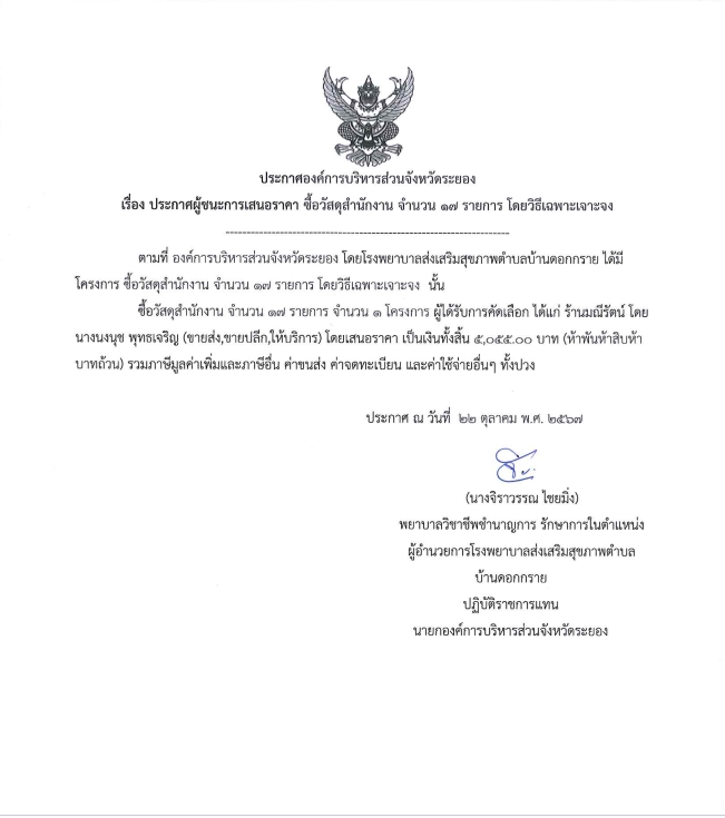 ประกาศผู้ชนะการเสนอราคา ซื้อวัสดุสำนักงาน จำนวน ๑๗ รายการ โดยวิธีเฉพาะเจาะจง