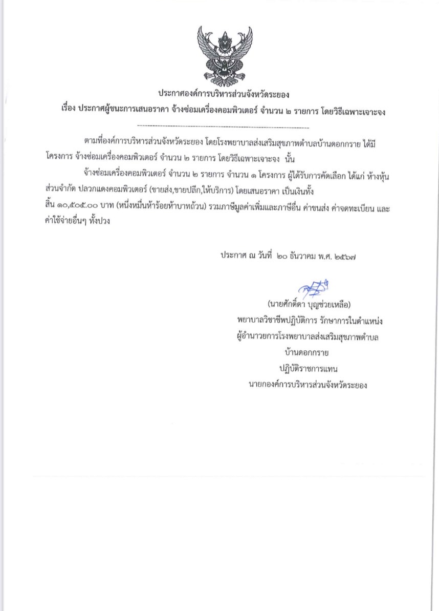 ประกาศผู้ชนะเสนอราคา จ้างซ่อมเครื่องคอมพิวเตอร์ จำนวน 2 รายการ โดยวิธีเฉพาะเจาะจง