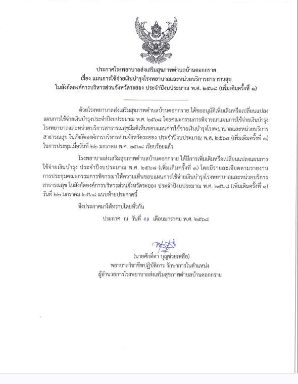 การประกาศใช้แผนการใช้จ่ายเงินบำรุงของโรงพยาบาลส่งเสริมสุขภาพตำบลบ้านดอกกราย ประจำปีงบประมาณ พ.ศ. 2568