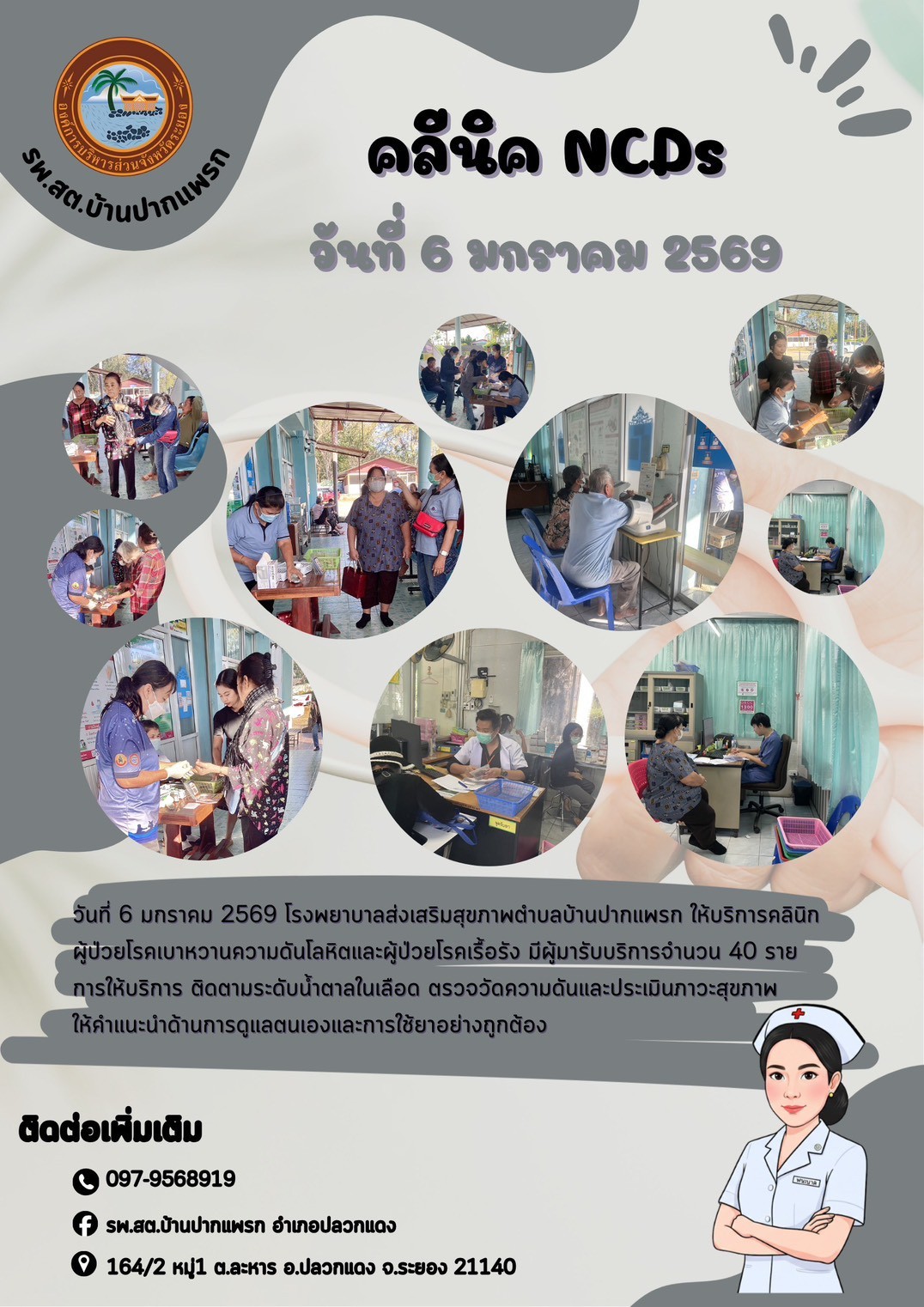 วันที่ 6 มกราคม 2569 รพ.สต.บ้านปากแพรก ให้บริการคลินิกโรคเบาหวาน ความดันโลหิตสูง และโรคเรื้อรัง จำนวน 40 ราย