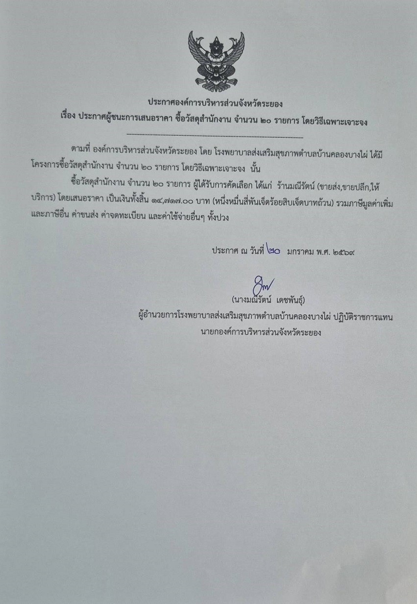 รพ.สต.บ้านคลองบางไผ่ > ข่าวสาร ประกาศ ประกาศผู้ชนะการเสนอราคา จัดซื้อวัสดุสำนักงาน จำนวน 20 รายการ โดยวิธีเฉพาะเจาะจง