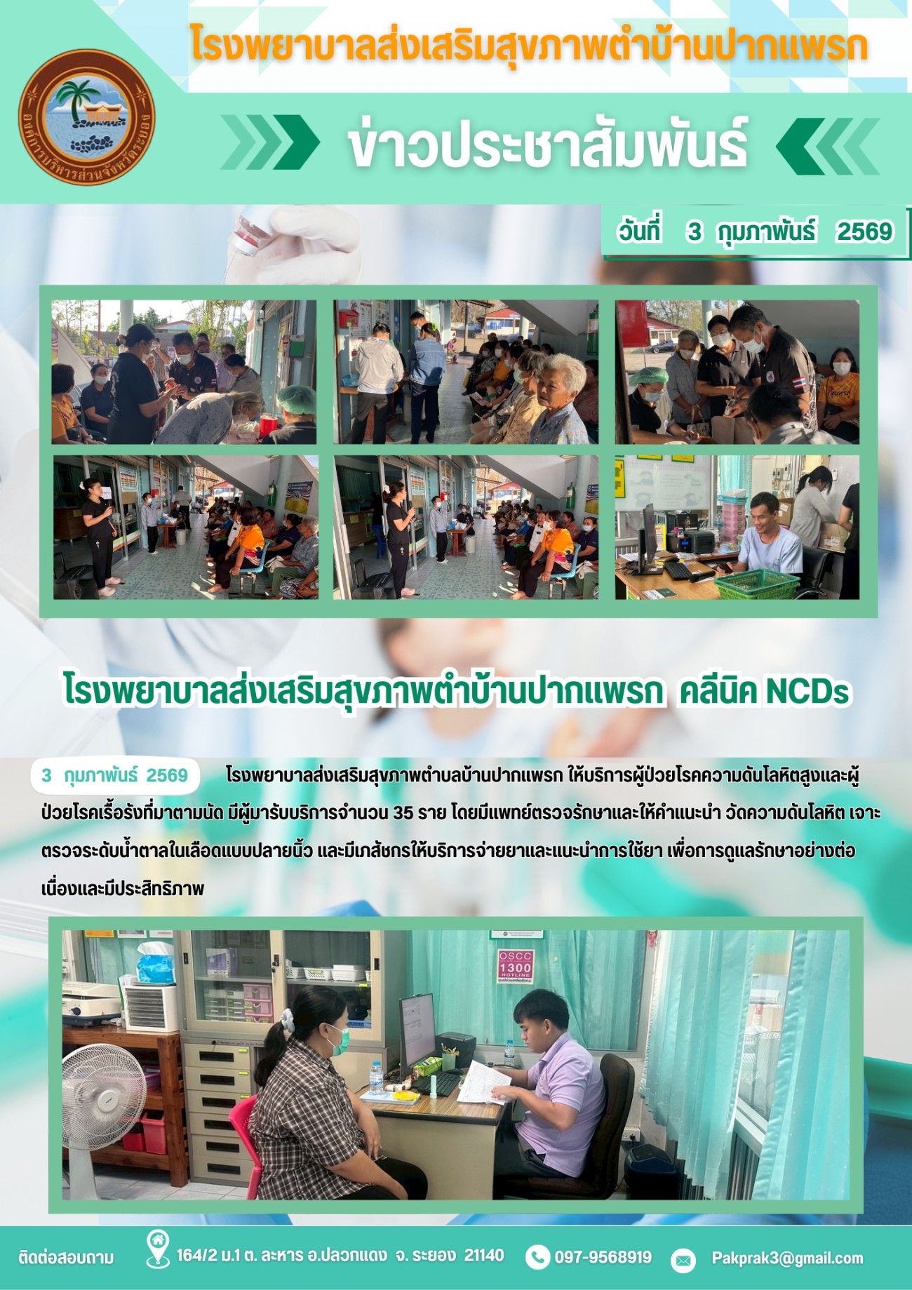 วันที่ 3 กุมภาพันธ์ 2569 รพ.สต.บ้านปากแพรก ให้บริการคลินิกโรคเบาหวาน ความดันโลหิตสูง และโรคเรื้อรัง จำนวน 35 ราย
