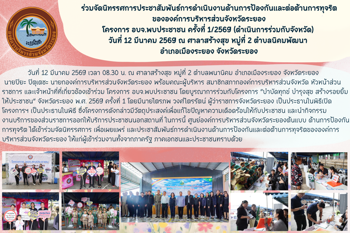 การประชาสัมพันธ์การดำเนินงานด้านการป้องกันและต่อต้านการทุจริต ของ อบจ.ระยอง โครงการ อบจ.พบประชาชน ครั้งที่ 1/2569 (ดำเนินการร่วมกับจังหวัด)