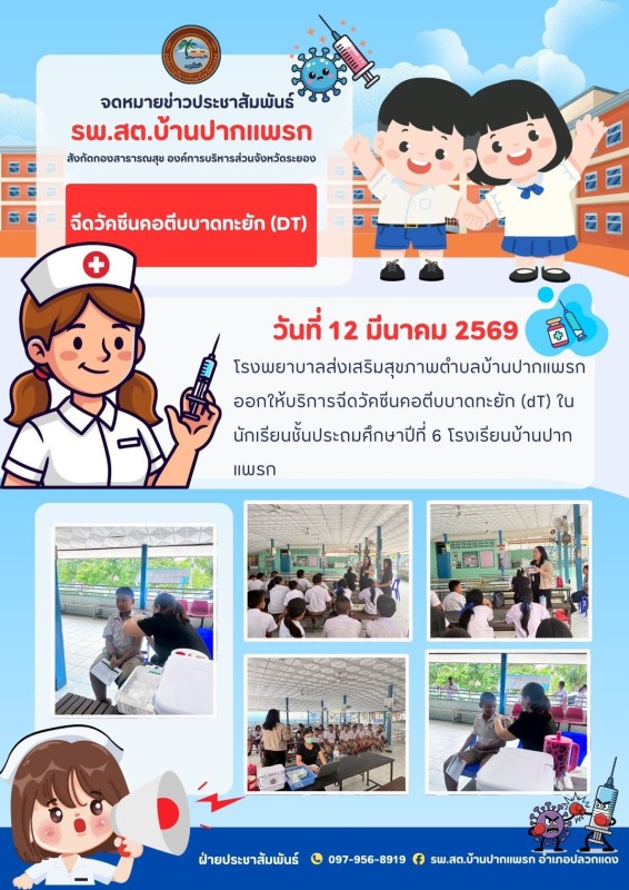 วันที่ 12 มีนาคม 2569 รพ.สต.บ้านปากแพรก ออกให้บริการฉีดวัคซีนคอตีบบาดทะยัก (dt) ในนักเรียนชั้น ม.6 โรงเรียนบ้านปากแพรก