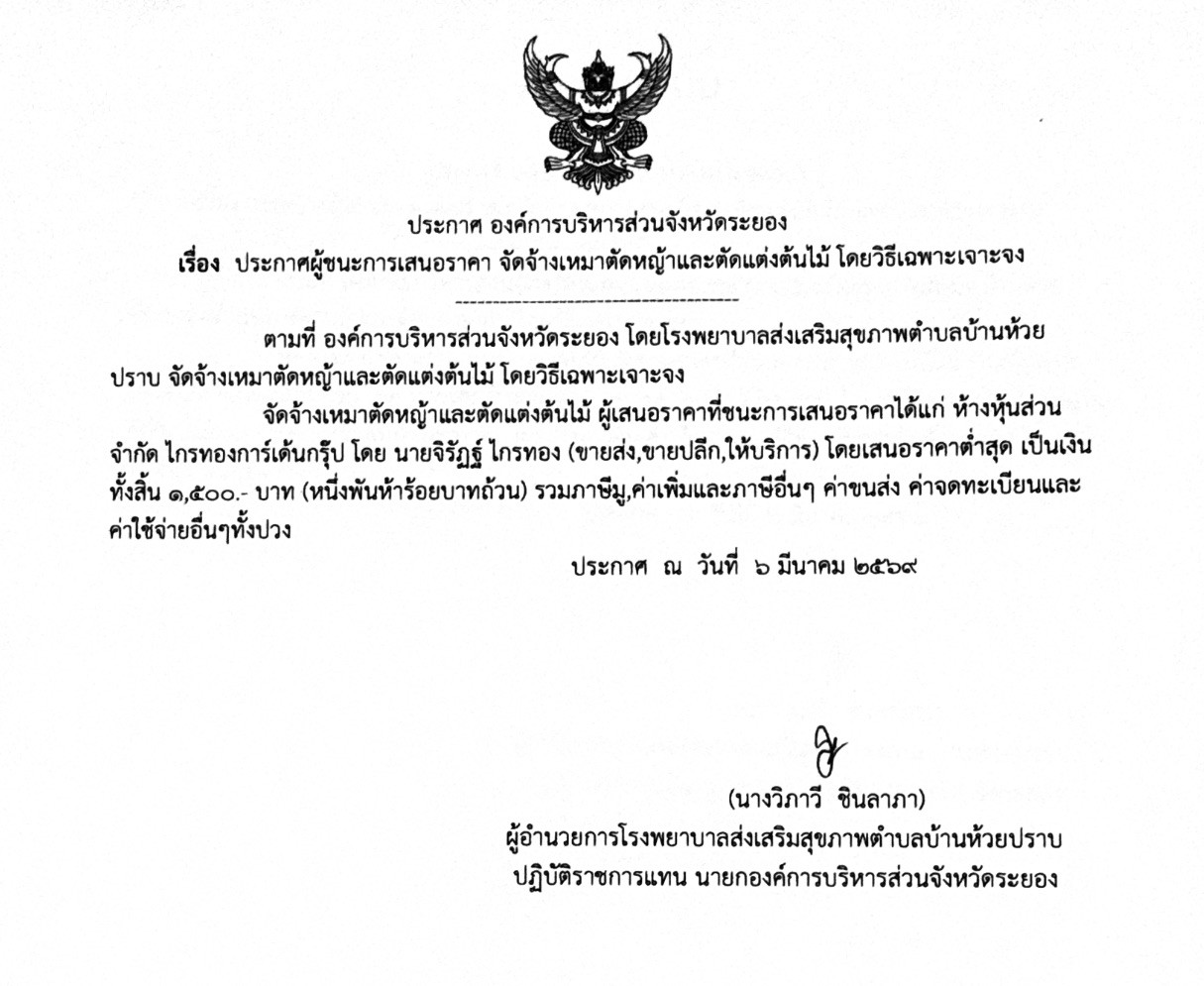 ตามที่ องค์การบริหารส่วนจังหวัดระยอง โดยโรงพยาบาลส่งเสริมสุขภาพตำบลบ้านห้วยปราบ จัดจ้างเหมาตัดหญ้าและตัดแต่งต้นไม้ โดยวิธีเฉพาะเจาะจงจัดจ้างเหมาตัดหญ้าและตัดแต่งต้นไม้ ผู้เสนอราคาที่ชนะการเสนอราคาได้แก่ ห้างหุ้นส่วนจำกัด ไกรทองการ์เด้นกรุ๊ป โดย นายจิรัฏฐ์ ไกรทอง (ขายส่ง,ขายปลีก,ให้บริการ) โดยเสนอราคาต่ำสุด เป็นเงินทั้งสิ้น 1,500.- บาท (หนึ่งพันห้าร้อยบาทถ้วน) รวมภาษีมู,ค่าเพิ่มและภาษีอื่นๆ ค่าขนส่ง ค่าจดทะเบียนและค่าใช้จ่ายอื่นๆทั้งปวง