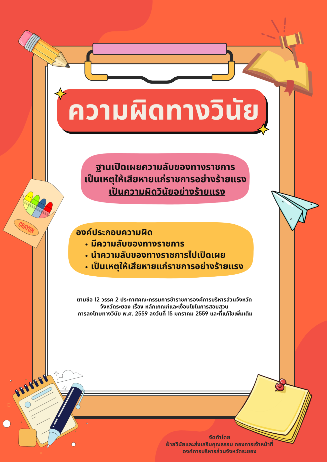 - การเผยแพร่เอกสารความรู้ด้านวินัยและเสริมสร้างคุณธรรม