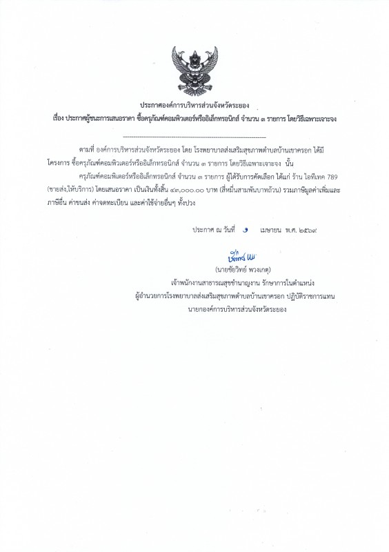 ประกาศผู้ชนะการเสนอราคา ซื้อครุภัณฑ์คอมพิวเตอร์หรืออิเล็กทรอนิกส์ จำนวน 3 รายการ โดยวิธีเฉพาะเจาะจง