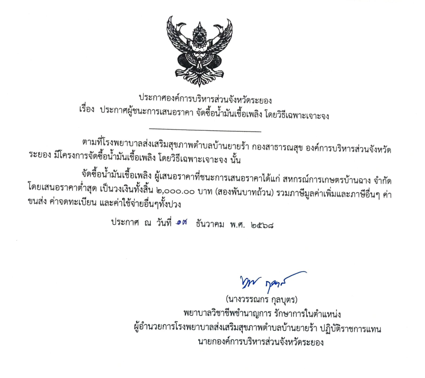 โรงพยาบาลส่งเสริมสุขภาพตำบลบ้านยายร้า > ข่าวประชาสัมพันธ์ ประกาศผู้ชนะการเสนอราคา จัดซื้อน้ำมันเชื้อเพลิง โดยวิธีเฉพาะเจาะจง