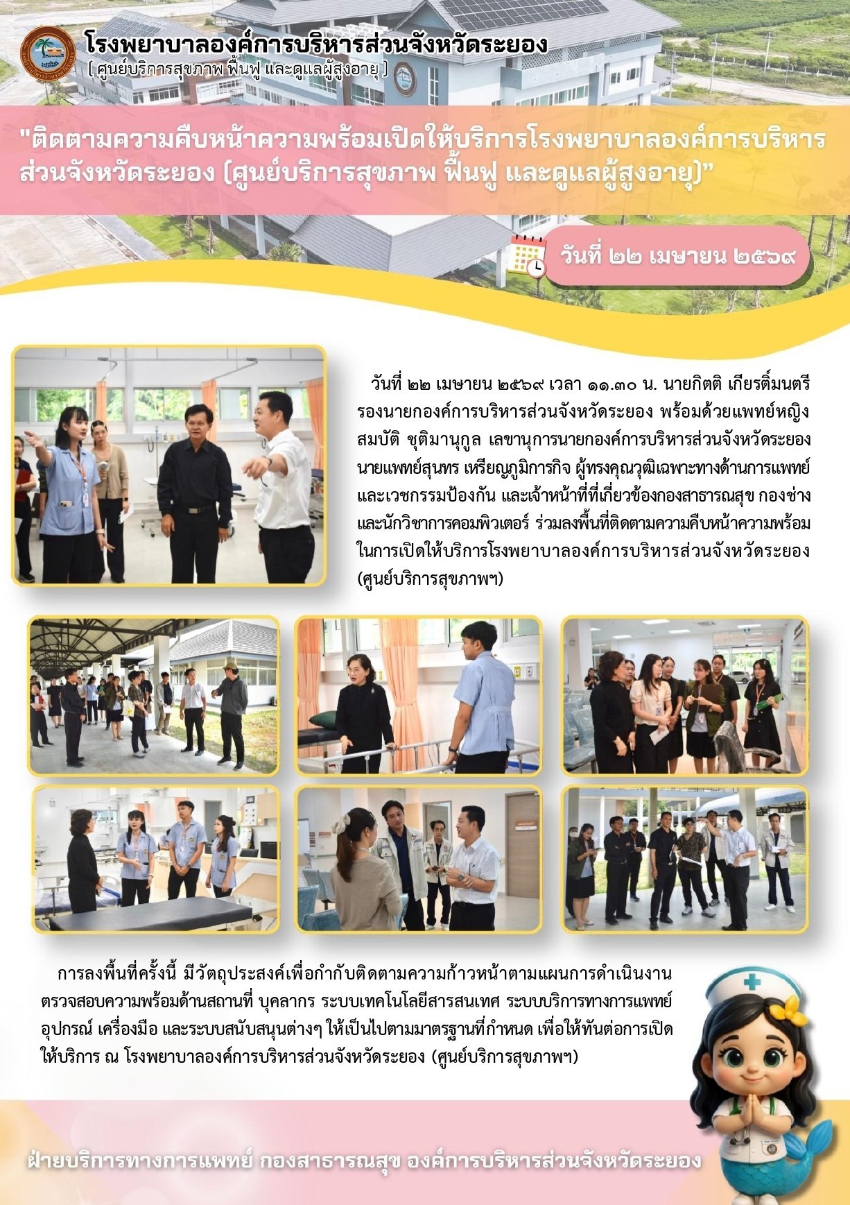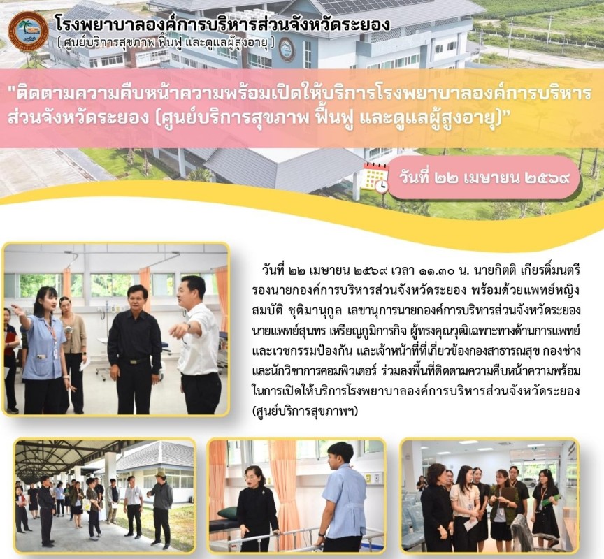 "ติดตามความคืบหน้าความพร้อมเปิดให้บริการโรงพยาบาลองค์การบริหารส่วนจังหวัดระยอง (ศูนย์บริการสุขภาพ ฟื้นฟู และดูแลผู้สูงอายุ) "