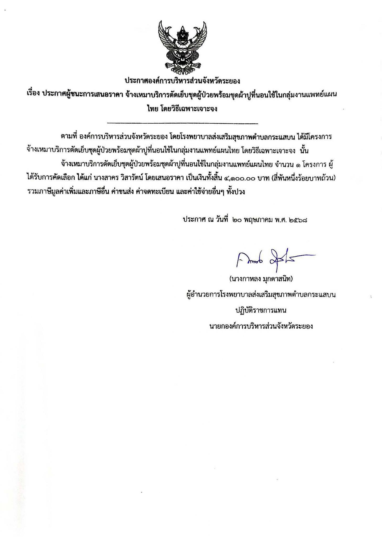 ประกาศผู้ชนะการเสนอราคา จ้างเหมาบริการตัดเย็บชุดผู้ป่วยพร้อมชุดผ้าปูที่นอนใช้ในกลุ่มงานแพทย์แผนไทย โดยวิธีเฉพาะเจาะจง