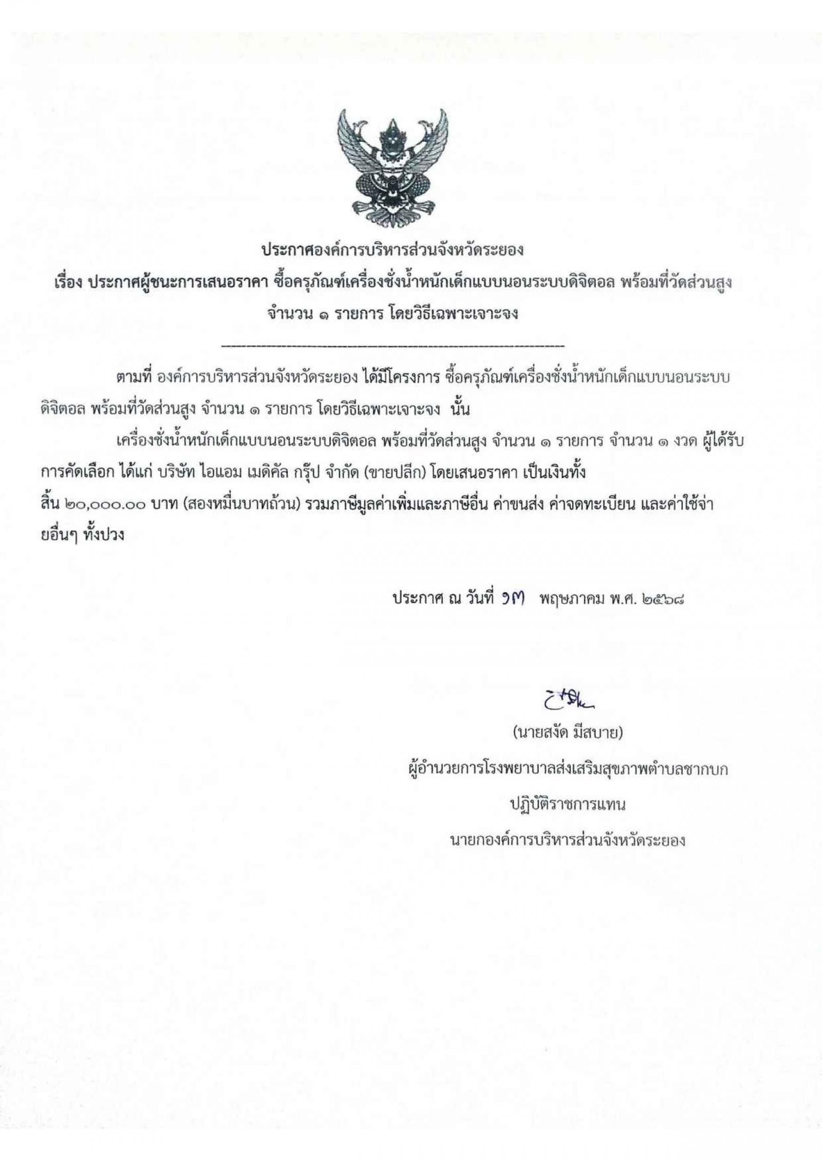 ประกาศผู้ชนะการเสนอราคา ซื้อครุภัณฑ์เครื่องชั่งน้ำหนักเด็กแบบนอนระบบดิจิดอล พร้อมที่วัดส่วนสูง จำนวน 1 รายการ โดยวิธีเฉพาะเจาะจง