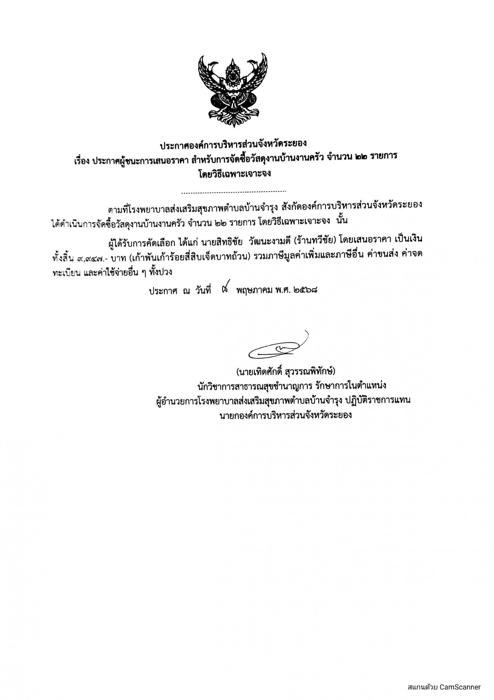 ประกาศผู้ชนะการเสนอราคา สำหรับการจัดซื้อวัสดุงานบ้านงานครัว จำนวน 22 รายการ โดยวิธีเฉพาะเจาะจง