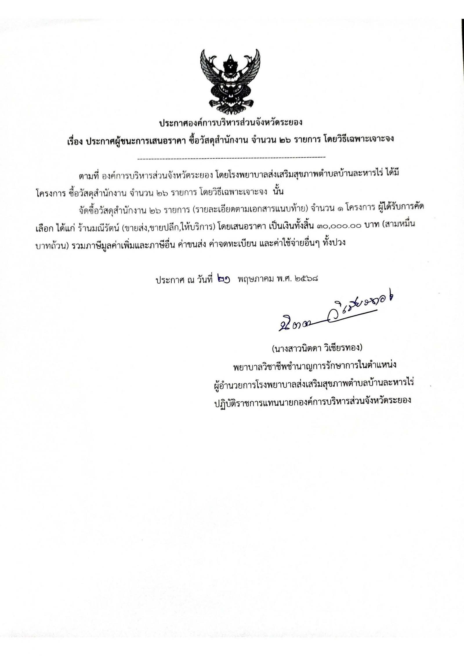ประกาศผู้ชนะการเสนอราคา ซื้อวัสดุสำนักงาน จำนวน 26 รายการ โดยวิธีเฉพาะเจาะจง