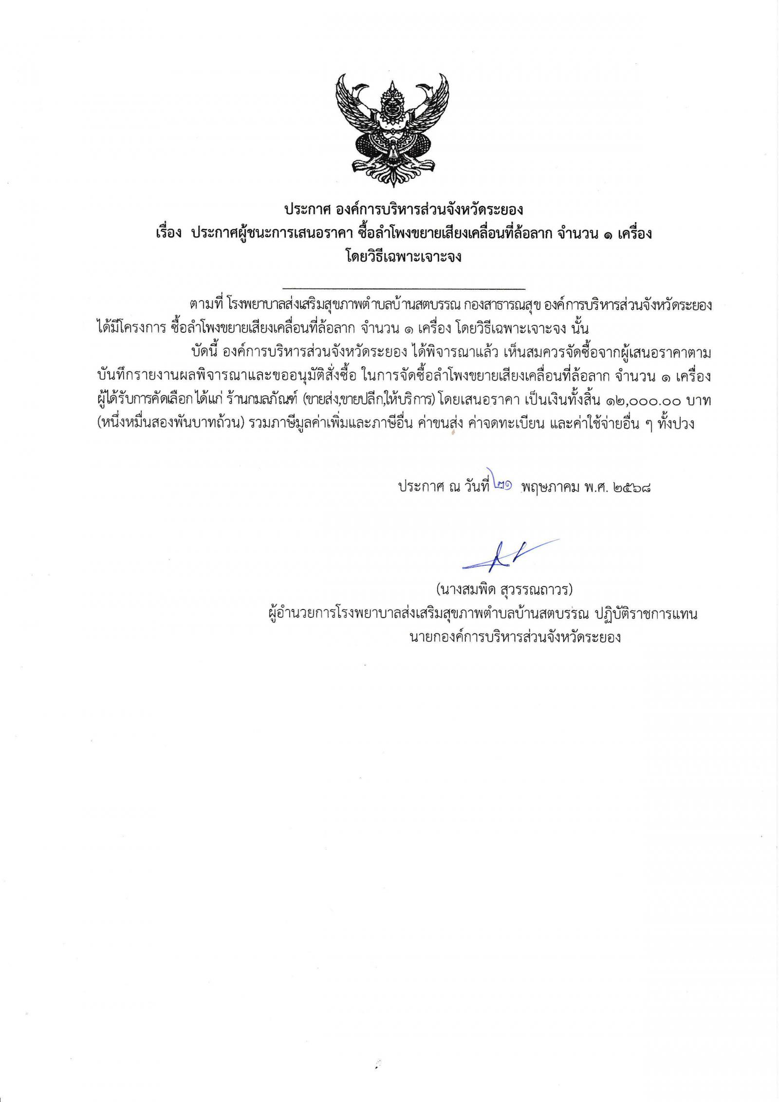 ประกาศผู้ชนะการเสนอราคา ซื้อลำโพงขยายเสียงเคลื่อนที่ล้อลาก จำนวน 1 เครื่อง โดยวิธีเฉพาะเจาะจง