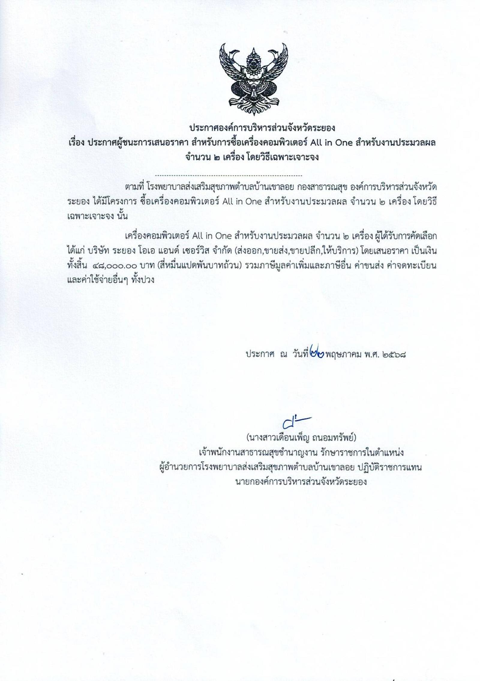 ประกาศผู้ชนะการเสนอราคา สำหรับการซื้อเครื่องคอมพิวเตอร์ All in One สำหรับงานประมวลผล จำนวน 2 เครื่อง โดยวิธีเฉพาะเจาะจง