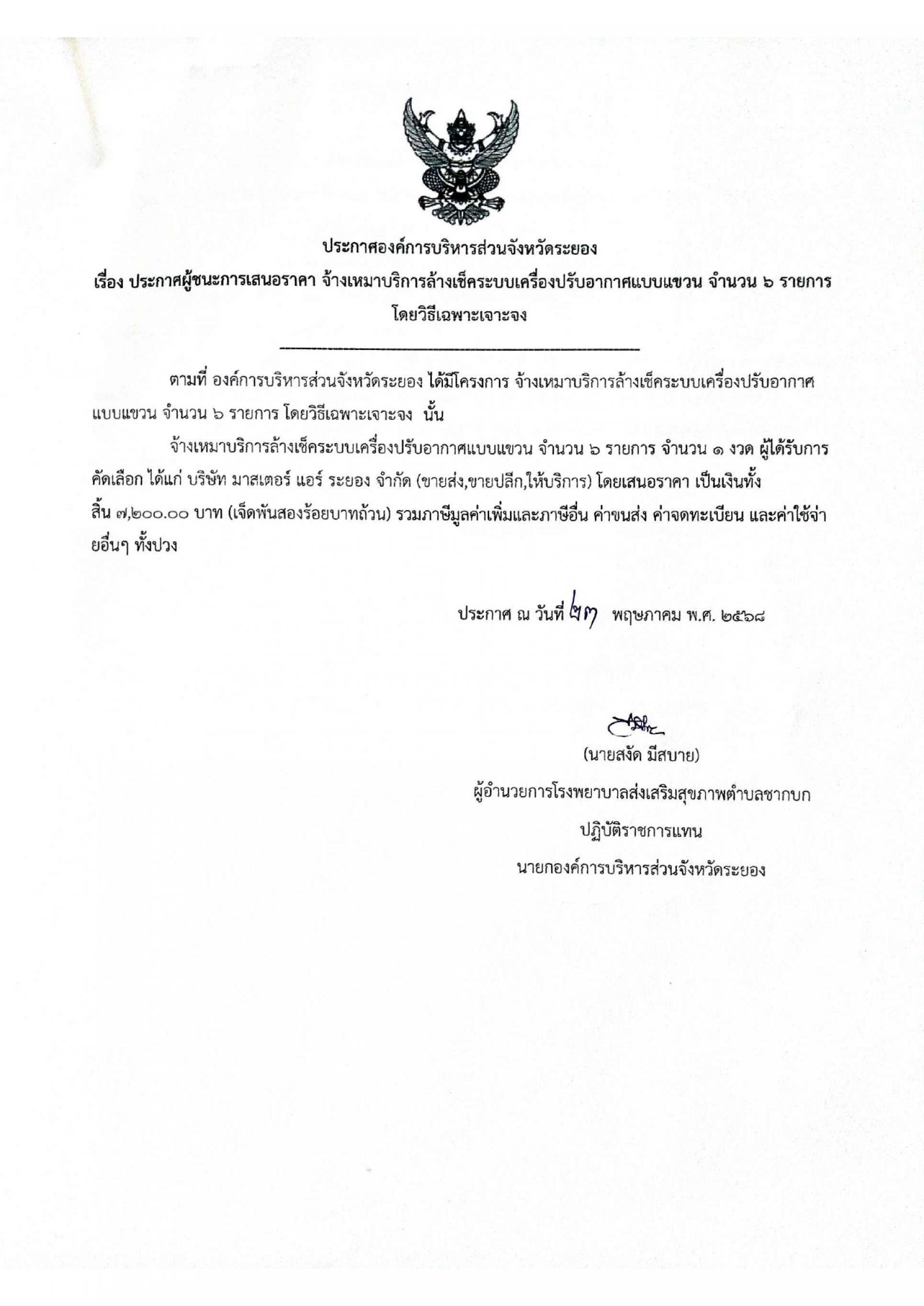 ประกาศผู้ชนะการเสนอราคา จ้างเหมาบริการล้างเช็คระบบเครื่องปรับอากาศแบบแขวน จำนวน 6 รายการ โดยวิธีเฉพาะเจาะจง