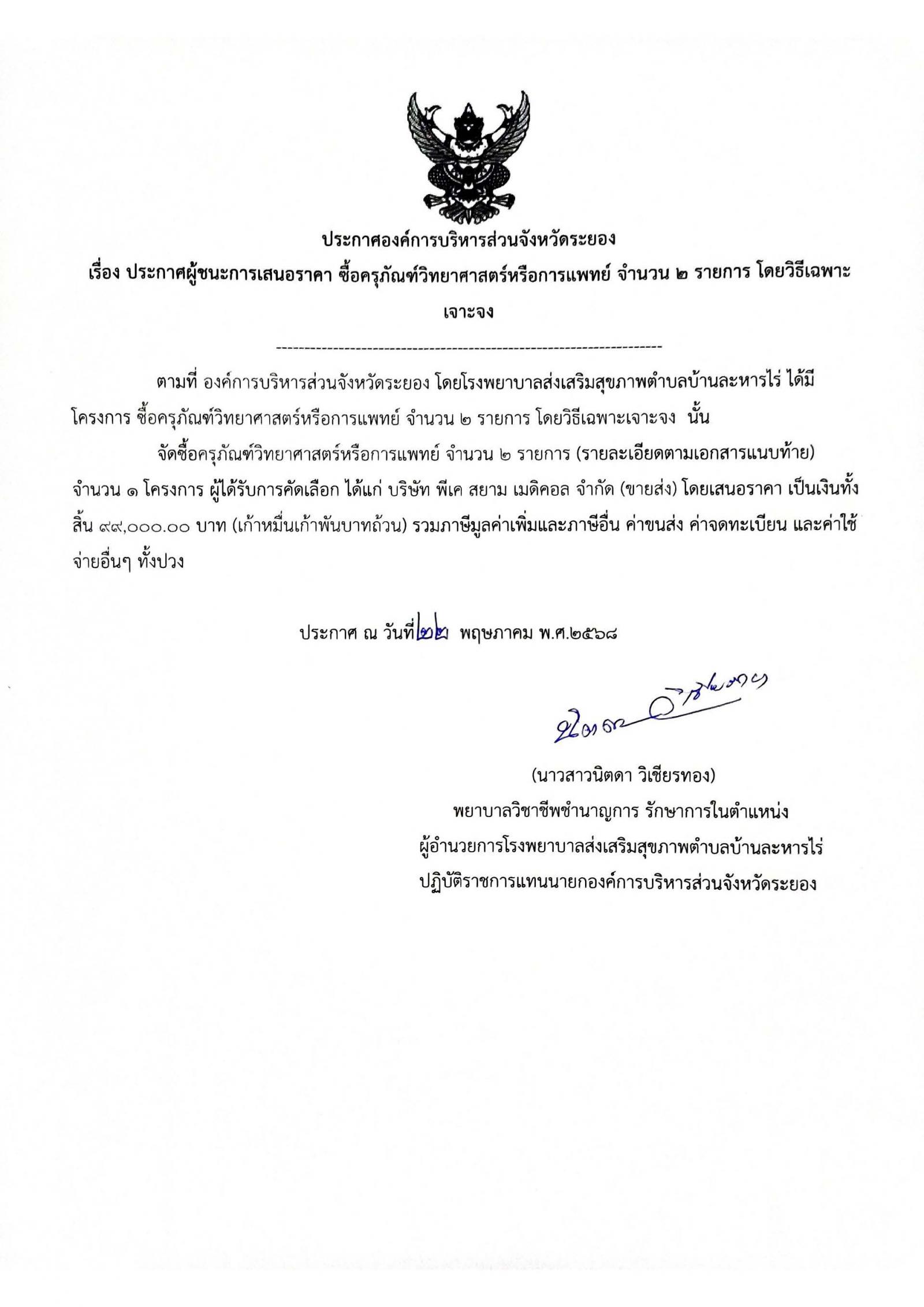 ประกาศผู้ชนะการเสนอราคา ซื้อครุภัณฑ์วิทยาศาสตร์หรือการแพทย์ จำนวน 2 รายการ โดยวิธีเฉพาะเจาะจง