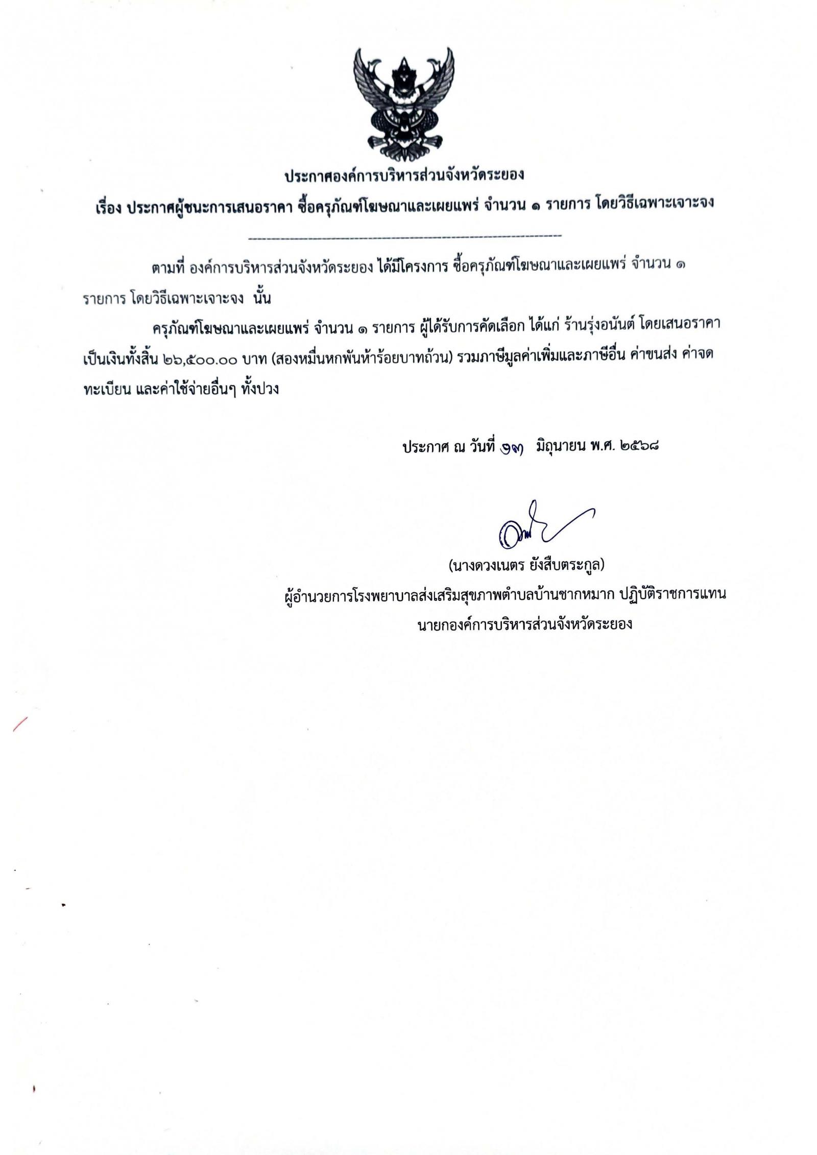 ประกาศผู้ชนะการเสนอราคา ซื้อครุภัณฑ์โฆษณาและเผยแพร่ จำนวน 1 รายการ โดยวีธีเฉพาะเจาะจง