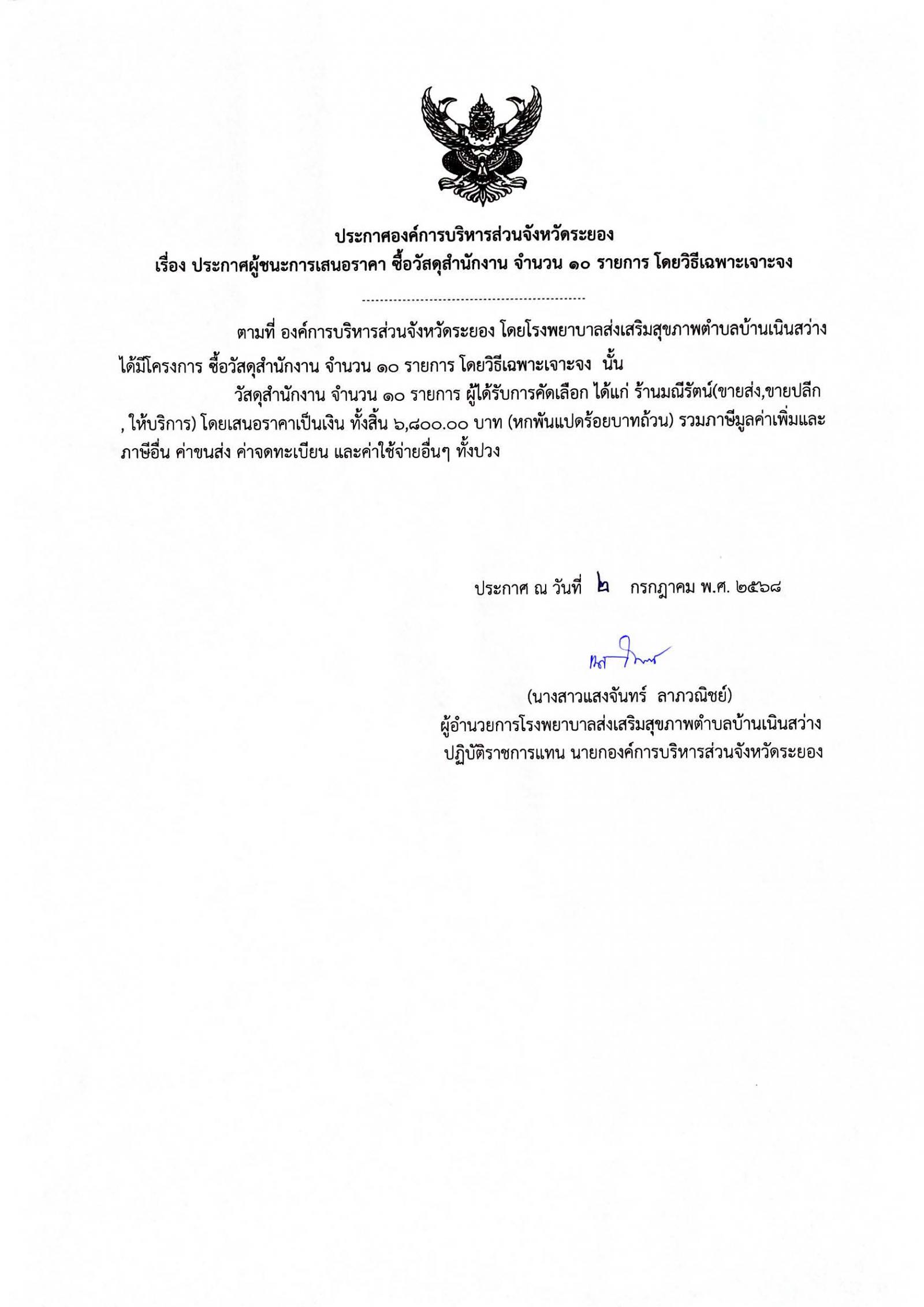 ประกาศผู้ชนะการเสนอราคา ซื้อวัสดุสำนักงาน จำนวน 10 รายการ โดยวิธีเฉพาะเจาะจง