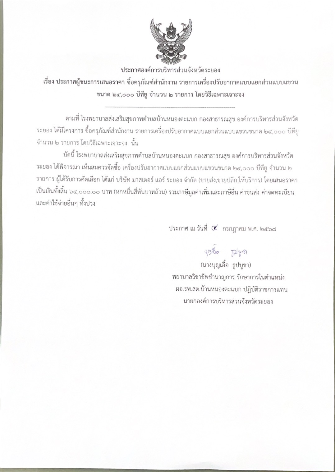 ประกาศผู้ชนะการเสนอราคา ซื้อครุภัณฑ์สำนักงาน รายการเครื่องปรับอากาศแบบแยกส่วนแบบแขวน ขนาด 24,000 บีทียู จำนวน 2 รายการ โดยวิธีเฉพาะเจาะจง