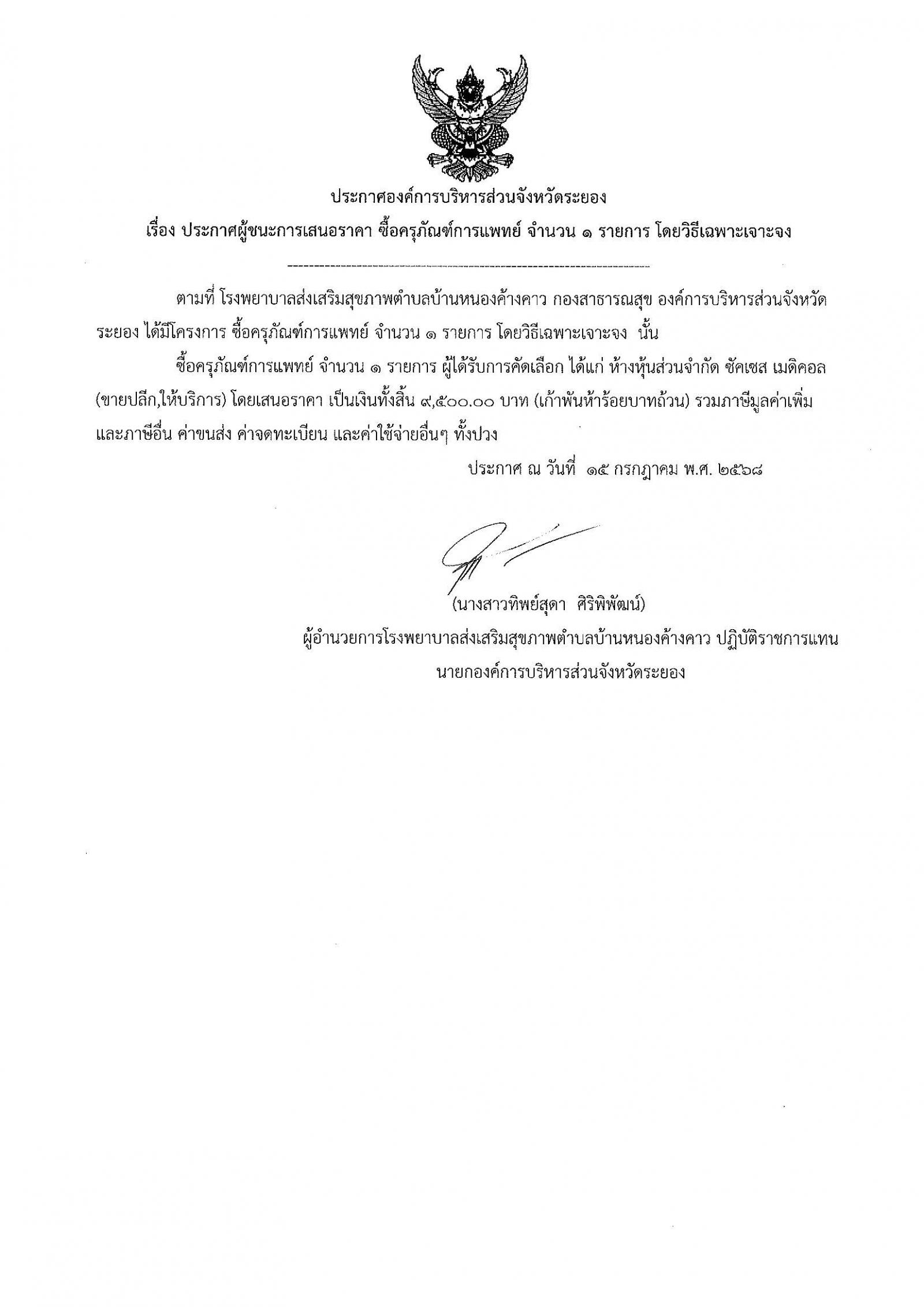 ประกาศผู้ชนะการเสนอราคา ซื้อครุภัณฑ์การแพทย์ จำนวน 1 รายการ โดยวิธีเฉพาะเจาะจง