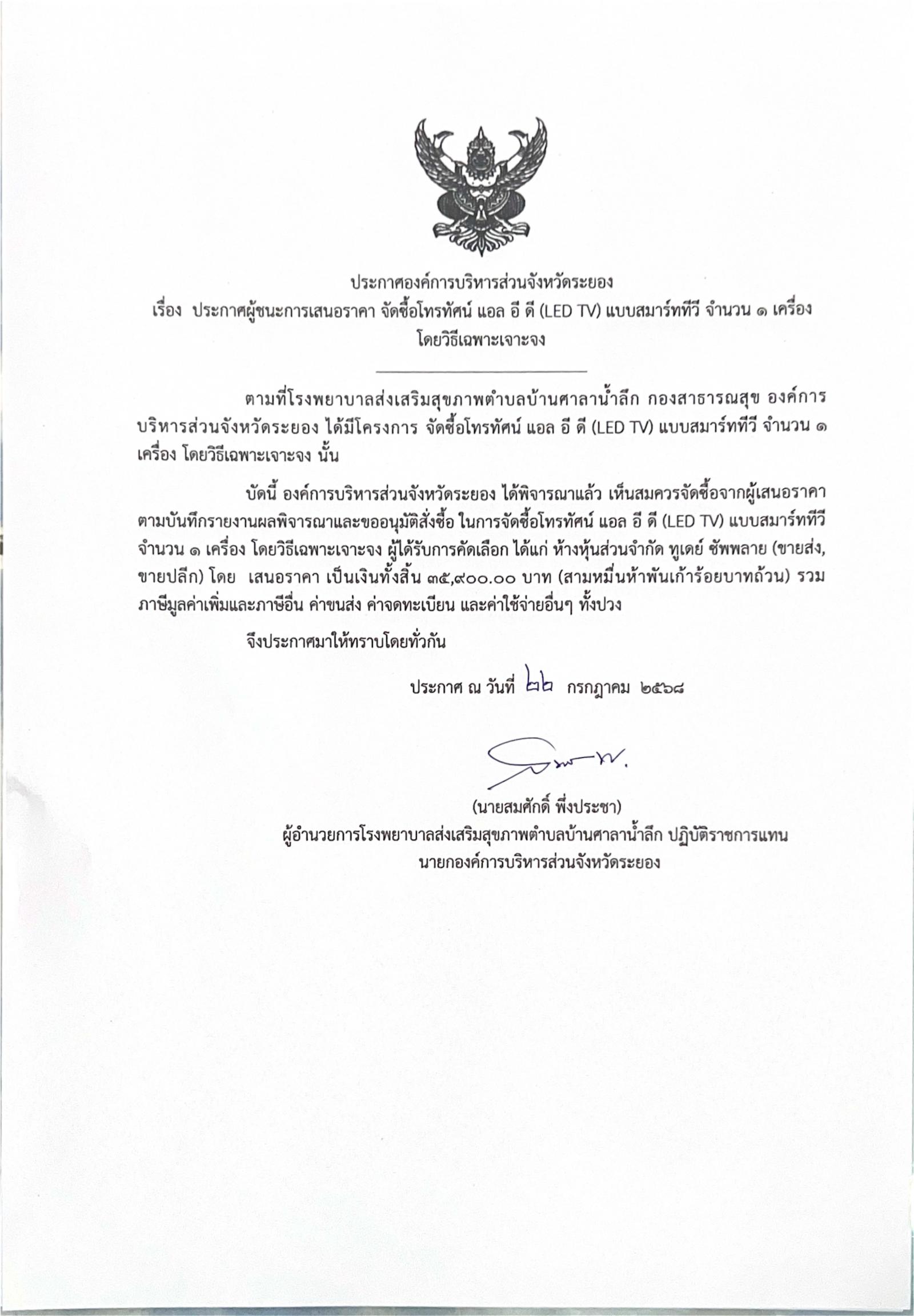 ประกาศผู้ชนะการเสนอราคา จัดซื้อโทรทัศน์ แอล อี ดี (LED TV) แบบสมาร์ททีวี จำนวน 1 เครื่อง โดยวิธีเฉพาะเจาะจง