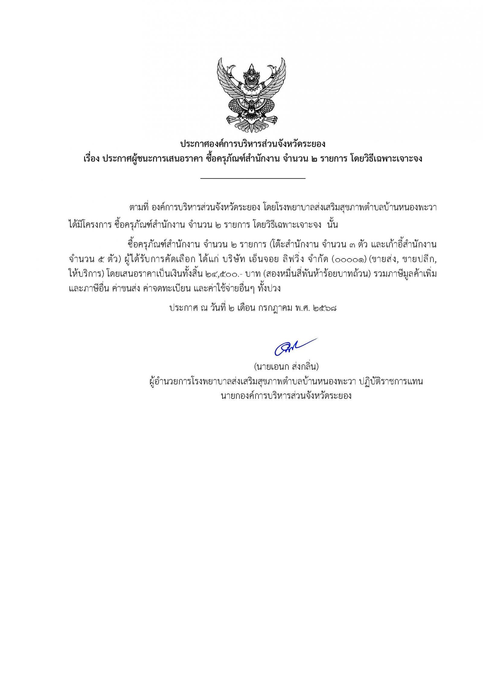 ประกาศผู้ชนะการเสนอราคา ซื้อครุภัณฑ์สำนักงาน จำนวน 2 รายการ โดยวิธีเฉพาะเจาะจง