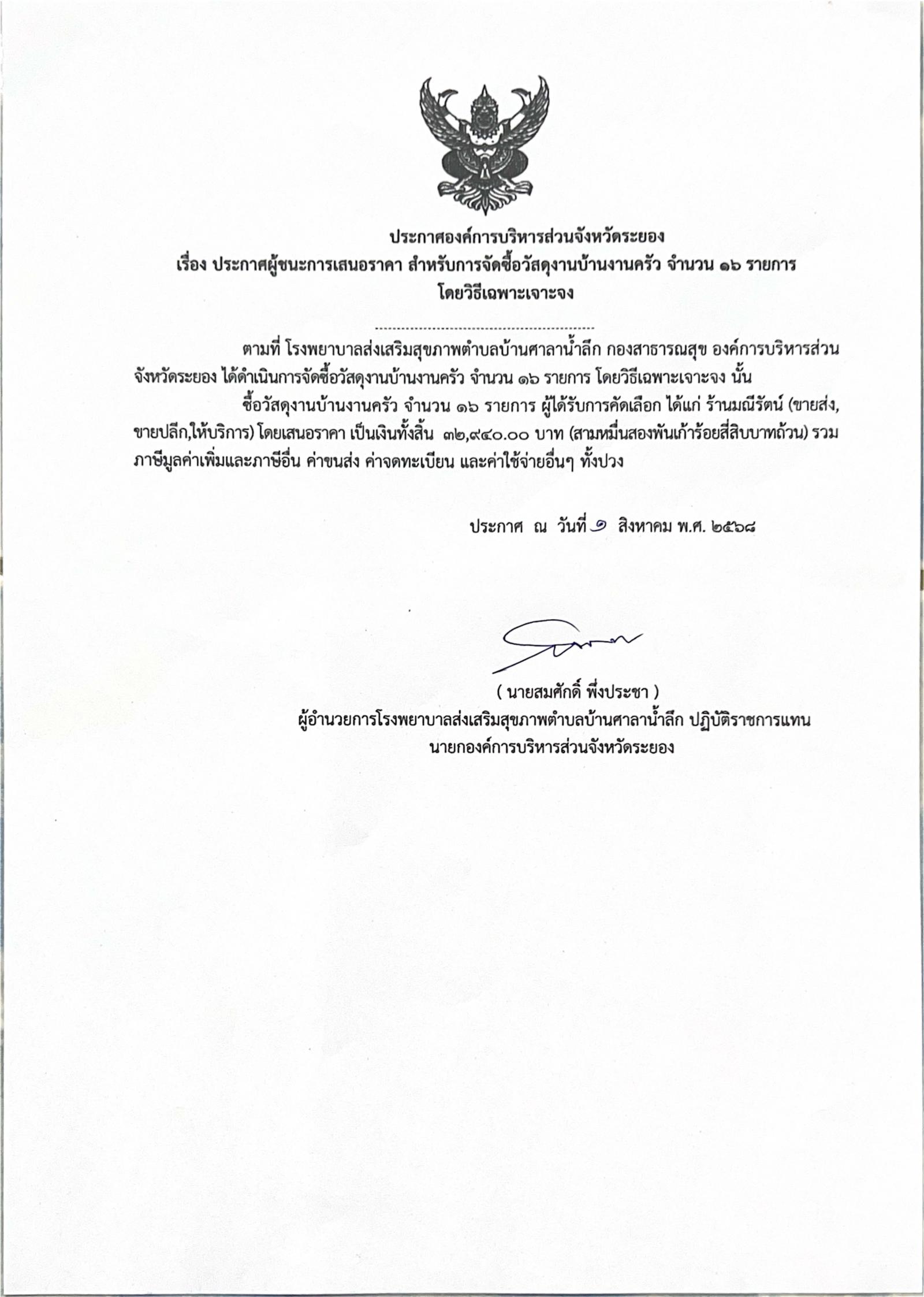 ประกาศผู้ชนะการเสนอราคา สำหรับการจัดซื้อวัสดุงานบ้านงานครัว จำนวน 16 รายการ โดยวิธีเฉพาะเจาะจง