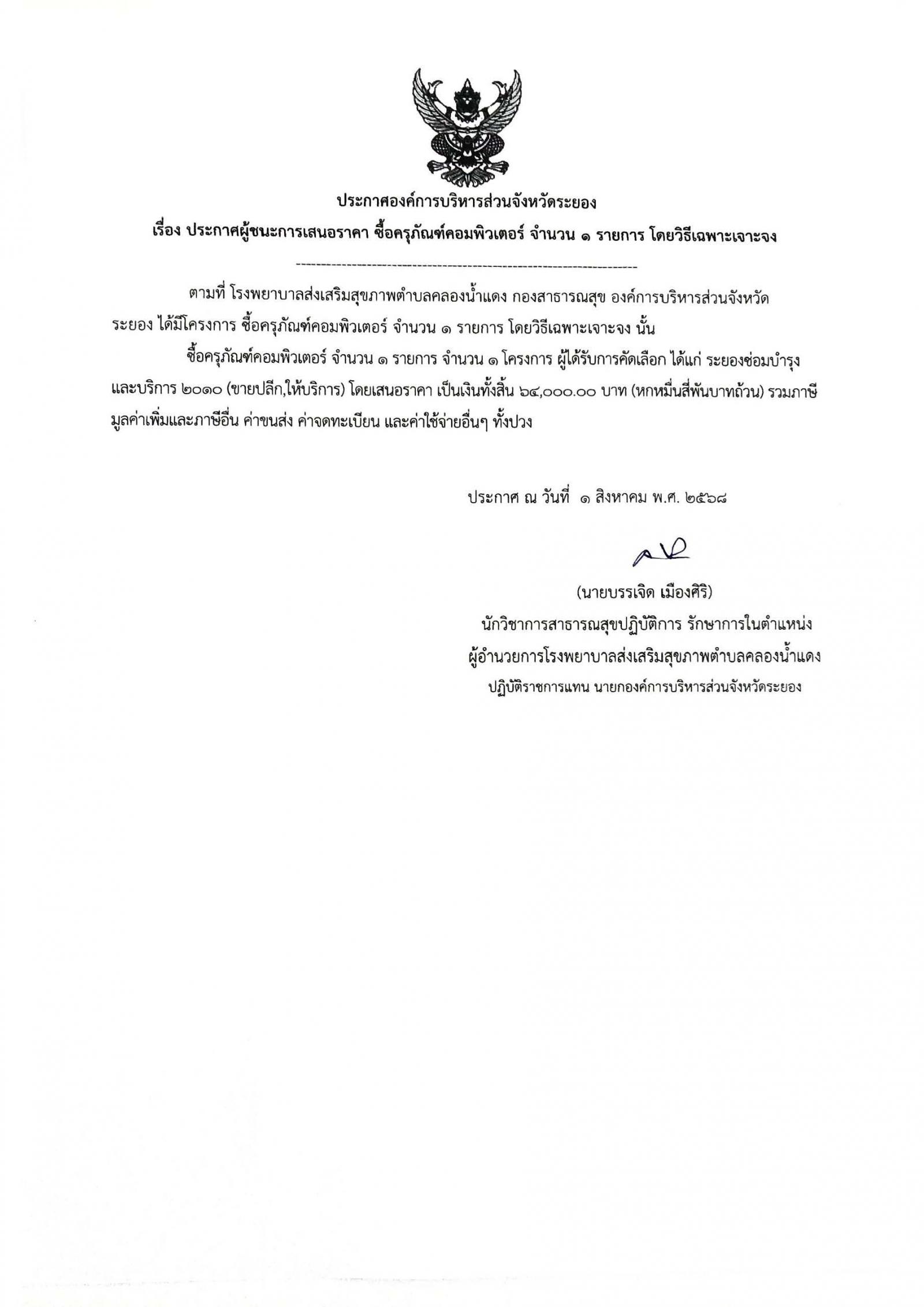 ประกาศผู้ชนะการเสนอราคา ซื้อวัสดุคอมพิวเตอร์ จำนวน 1 รายการ โดยวิธีเฉพาะเจาะจง